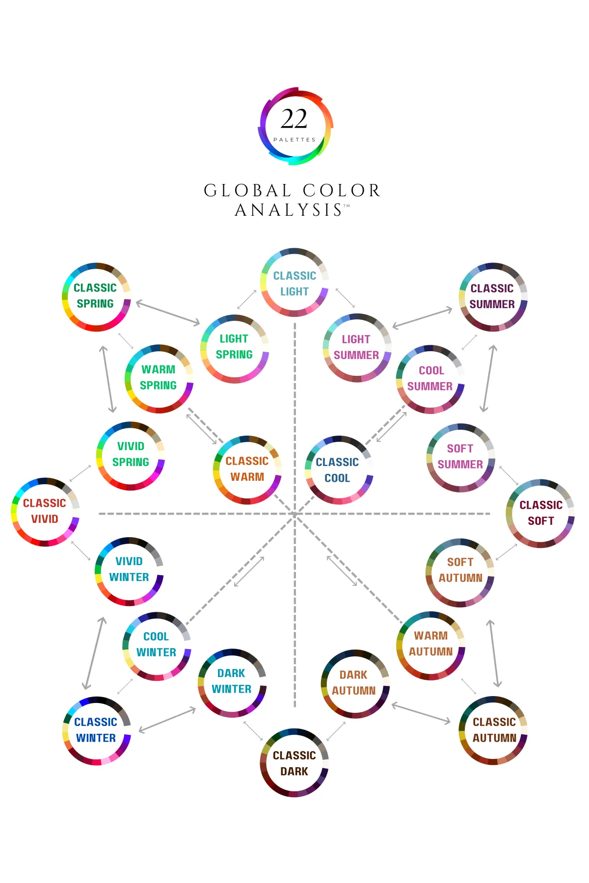 The Global Color Analysis System offers 22 carefully curated palettes for warm, cool, and neutral undertones. Whatever your unique coloring, there’s a palette designed just for you—so you can look and feel your absolute best with colors that truly complement you.